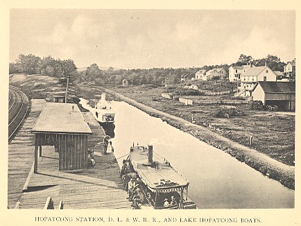 A busy scene, circa 1905. Boats wait to pick up passengers who would disembark from the Trains at the Landing station. The boats would then take them up a Canal a bit, then into the feeder canal and on to Lake Hopatcong. A train is coming eastbound from the Hackettstown area, and the siding at top left holds some sidelined Freight Cars |
